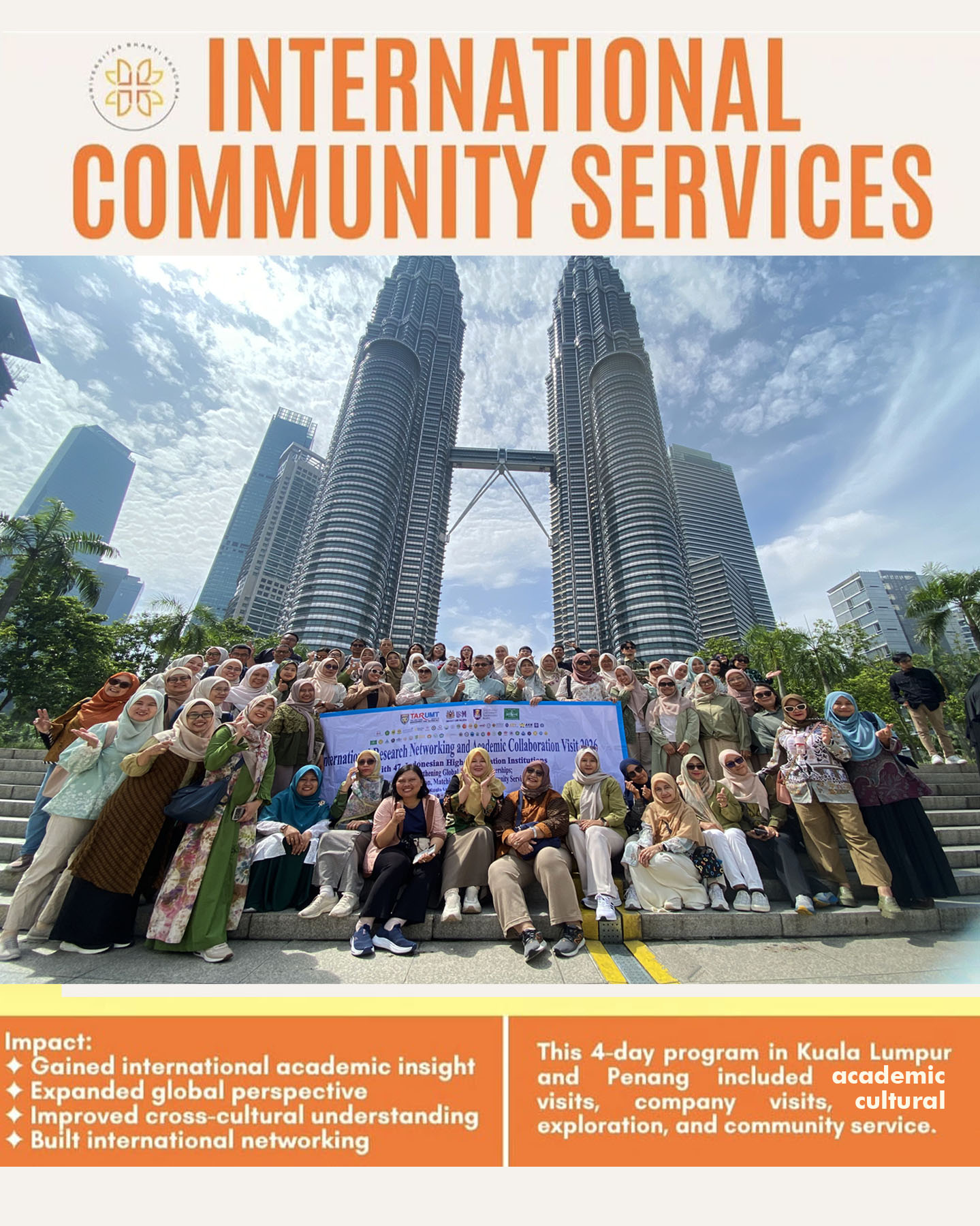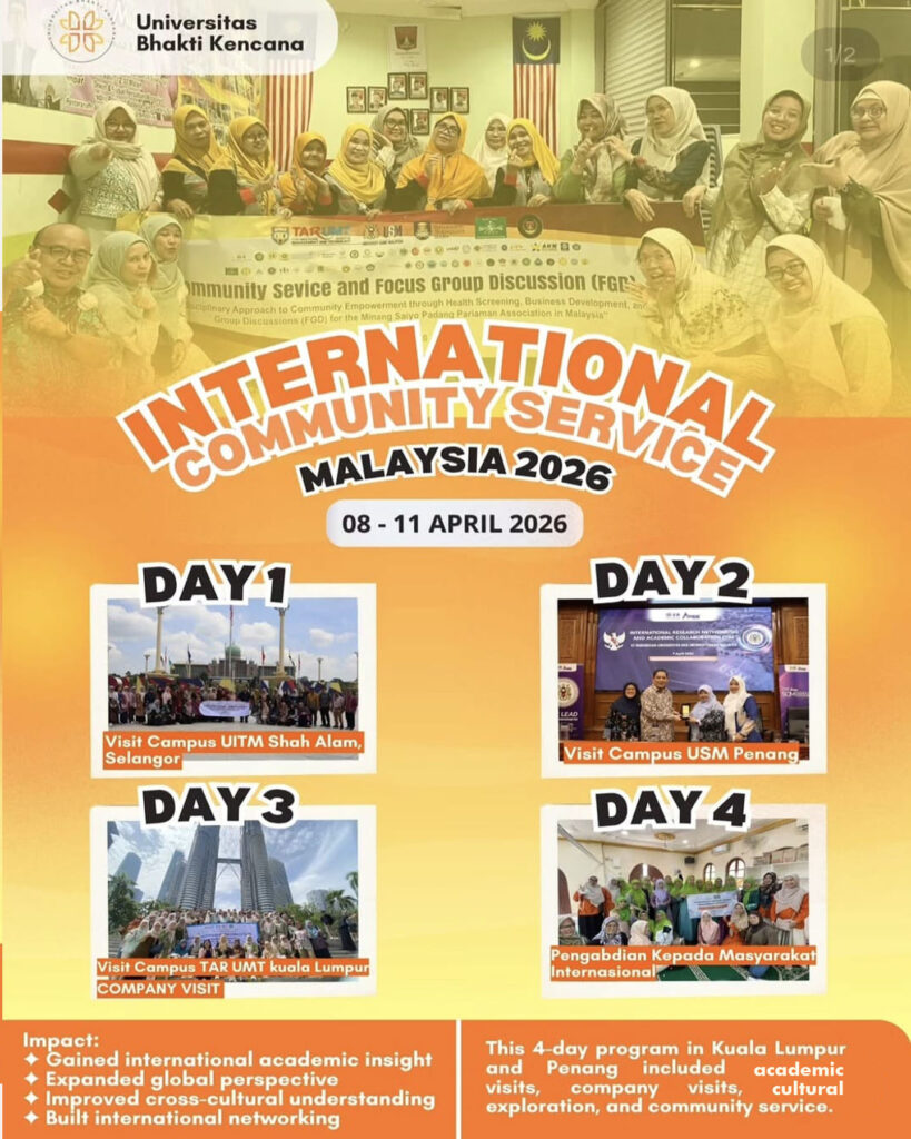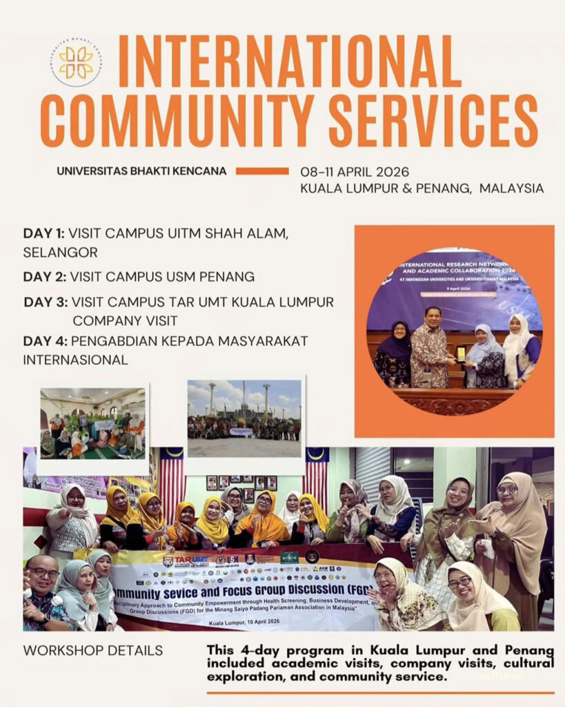 Kegiatan International Community Service yang diselenggarakan oleh Universitas Bhakti Kencana pada tanggal 08–11 April 2026 di Kuala Lumpur dan Penang, Malaysia, merupakan bentuk implementasi tridharma perguruan tinggi dalam skala global. Program ini melibatkan kolaborasi lintas institusi serta mitra internasional dalam upaya meningkatkan kapasitas akademik dan pengabdian kepada masyarakat.
